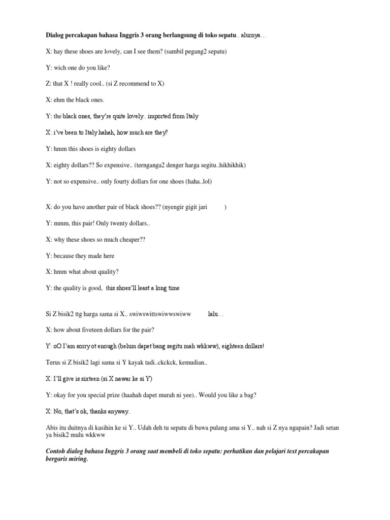 Belajar bahasa inggris tentu harus dipraktekkan terutama bila anda tujuannya untuk menguasai speaking skills maka harus rajin latihan berbicara menggunakan bahasa inggris sesering mungkin. Berikut adalah beberapa contoh dialog bahasa inggris dalam telepon. Dialog ucapan selamat bahasa inggris untuk 4 orang berikut adalah contoh dialog pendek untuk 4 orang dalam rangkah mengucapkan selamat atas keberhasilan dan mendapat nilai terbaik dalam suatu ujian. Setelah itu bisa meningkat pada topik lainnya seperti pekerjaan, hobi, dan. Contoh percakapan interview kerja dalam bahasa inggris dan artinya. Contoh di atas dapat berbeda sesuai dengan tema percakapan dan orang yang kita ajak berbicara. Tuliskan pengalaman hidup orang orang yang mati martir berikut ini:a.polikarpusb.jhon wycliffec.william tyndaled.john bunyan. Orang tuaku mendatangkan guru khusus untuk mengajar adikku. Inggris (4 orang) indra agus indra agus indra agus indra agus indra : Pasti mereka akan menjawab praktek adalah cara terbaik. terdapat dialog konotasi kasar: Ada 2 orang di sekolah. Demikian materi conversation kali ini mengenai contoh dialog bahasa inggris lengkap dengan arti, jelas dan mudah untuk dua orang, semoga bermanfaat dan bisa membantu.