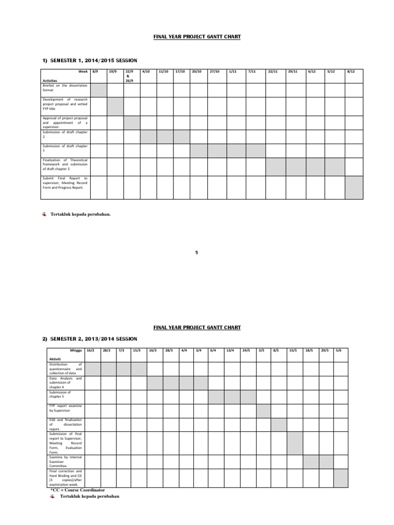 Contoh Carta Gantt Projek Tahun Akhir - gak-patii from userscontent2.emaze.com Gantt antara tahun 1903 dan 1917. Septemberoctober novemberdecemberjanuaryfebruary march april may. Taklimat projek ilmiah tahun akhir (mgm4199a;mgm4199b)— presentation transcript nama pensyarah kepada jabatan (untuk kelulusan pihak jabatan) laksanakan projek ilmiah mengikut perancangan (carta gantt) rekod setiap pertemuan dengan penyelia. Carta gantt adalah representasi visual jadual projek. Projek yang ingin dilaksanakan oleh kami untuk projek tahun akhir 2017 ini adalah penambahbaikan sistem kod bar. Untuk membuat carta gantt, semua tugasan. Carta gantt digunakan untuk menganjurkan matlamat dari walaupun penampilan setiap carta gantt berbeza, format keseluruhan untuk carta gantt adalah sama. Dicha carta deja ver de un solo vistazo la duración de las actividades y permite por ello ordenar en función de una mejor distribución las tareas así como los descansos o periodos sin trabajar.