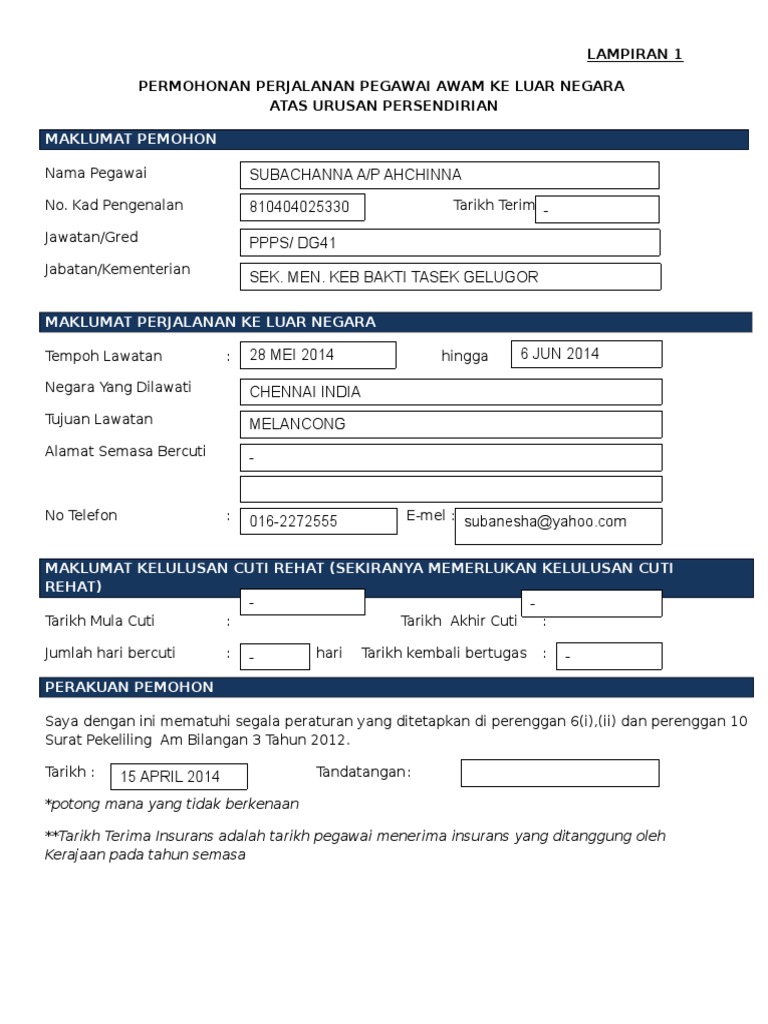2 from Garis panduan permohonan perjalanan pegawai awam ke luar negara urusan persendirian 2019 ii. Permohonan boleh dilakukan secara online. Membuat surat permohonan melepas kewarganegaraan republik indonesia kepada presiden. Tetapi ini memerlukan waktu yang agak lama karena situs ini menerapkan flat rate post, artinya jika berat buku yang anda pesan lebih. Bermula 7 oktober 2020, semua permohonan kebenaran keluar dan masuk negara boleh dibuat secara online melalui portal mytravelpass. Pegawai am yang ingin membuat permohonan boleh mengisi borang ini dan hantar kepada ketua jabatan anda. Pemohonan kebenaran ke luar negara atas urusan persendirian, pegawai tidak layak menuntut semua jenis elaun, kemudahan atau bayaran yang diperuntukkan kepada pegawai yang menjalankan tugas rasmi. Keanggunan yang dimiliki oleh pesona yang teramat mulia paduka seri pengiran anak isteri pengiran anak sarah menjadi bualan hangat sehingga ke hari ini.