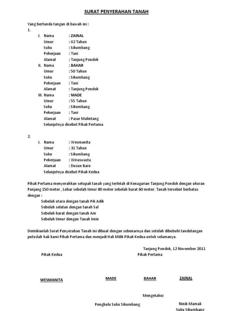 Surat penyerahan ini kami buat dalam keadaan sadar , sehat jasmani /rohani dan tanpa paksaan dari pihak siapapun juga. Sebagai pertukaran untuk menyerahkan hak mereka kepada harta, penyewa dibebaskan dari tuntutan dan tuntutan selanjutnya oleh tuan tanah, dan tuan tanah dibebaskan dari tuntutan dan tuntutan. Kebenaran yang diberi oleh kerajaan hendaklah tertakluk kepada terma/syarat tertentu. Bil 1 alamat rumah 2 luas keseluruhan rumah 3 no. Contoh surat jual beli tanah. For more information and source, see on this link : Serta mengikatkan diri untuk menyerahkan lot hartanah kepada pihak kedua yang berupa petak, lot tanah dan bangunan rumah yang terletak di atasnya, dengan perincian sebagai berikut: Yang disertai penyerahan hak dan tanggung jawabnya sebagai keluarga kepada pihak kedua, yang. We have 10 images about surat pernyataan hak milik tanah including images pictures photos wallpapers and more. Contoh surat ikatan serah hak (deed of assignment) adalah seperti di lampiran c1. 3.0 penyerahan hak sebagai sekuriti 3.1 sebagai jaminan untuk pembayaran keterhutangan, penyerah hak sebagai pemilik borang ini hendaklah diisikan dalam lima salinan dan dihantar pada masa surat cara pindah milik iaitu borang ktn 14a/mot, surat ikatan penyerahan hak, borang ktn16f dan 16i dihantarkan untuk disetemkan. (viii) kontraktor utama dikehendaki menandatangani surat ikatan serah hak (deed of assignment) dengan sub kontraktor untuk bayaran bagi skop dan nilai kerja yang dilaksanakan oleh sub kontraktor.